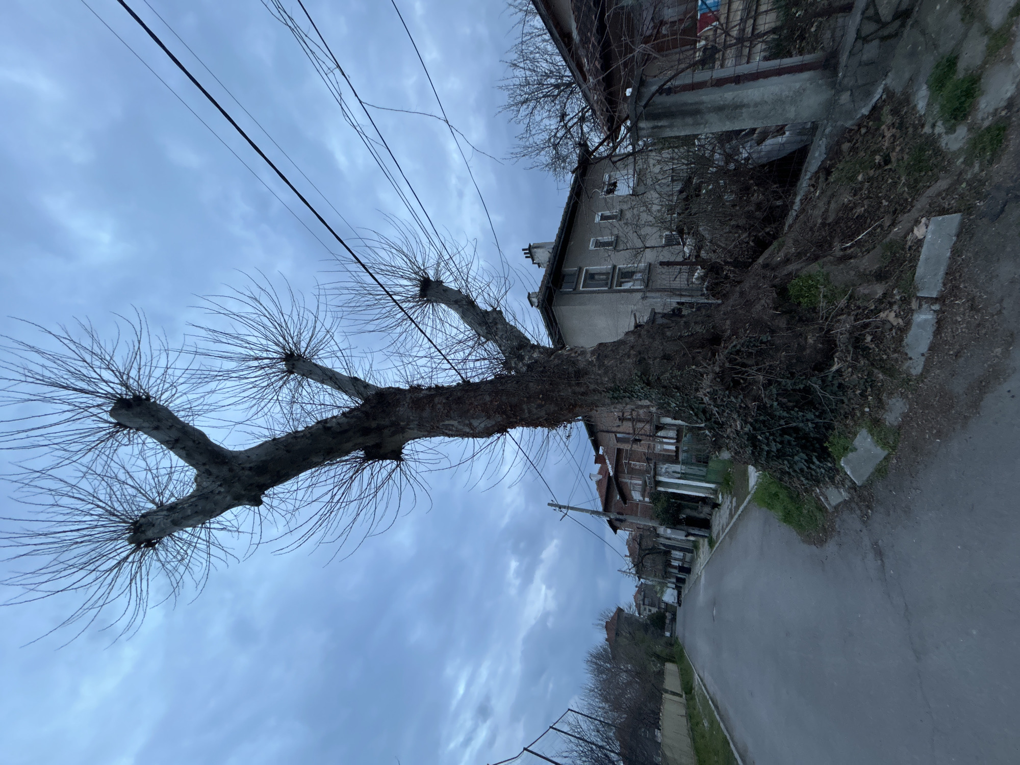 The image presents a street scene in Plovdiv, Bulgaria. In the foreground, a pollarded tree with bare branches dominates the left side of the frame, its trunk covered with ivy. Overhead, electrical wires stretch across the sky, which is overcast with a cloudy, grey sky. Along the right side, buildings of varying heights and architectural styles are visible, constructed from brick and stone. A grey asphalt road occupies the bottom right quadrant of the picture. The overall lighting conditions suggest either early morning or late afternoon. No individuals are visible in the scene.