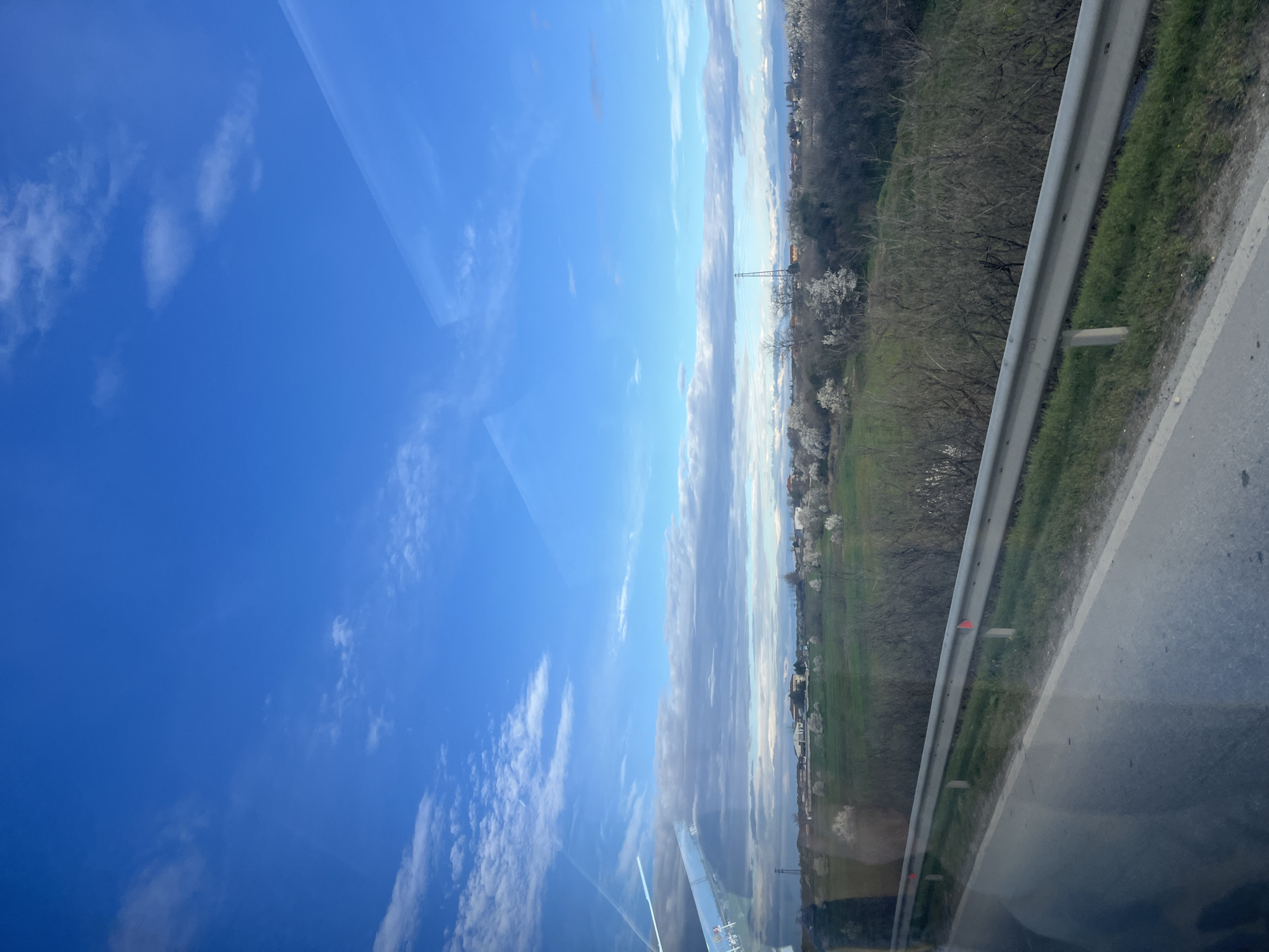 The scene is viewed from inside a vehicle. The location appears to be near Benkovski, Bulgaria. The sky is blue with scattered clouds. A road with a guardrail runs adjacent to a grassy area leading to trees. In the distance are houses and fields. There is an electrical power pylon. The image appears to have been taken through a vehicle window.