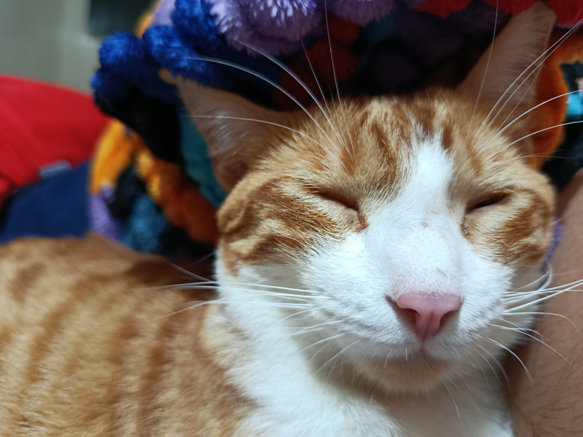 A close-up shot shows a sleeping orange and white cat with a pink nose and closed eyes. The cat is nestled against a colorful, plush object. A human arm is visible to the right of the cat. The location in the city of Altagracia, Venezuela is unknown, and cannot be determined from the image.