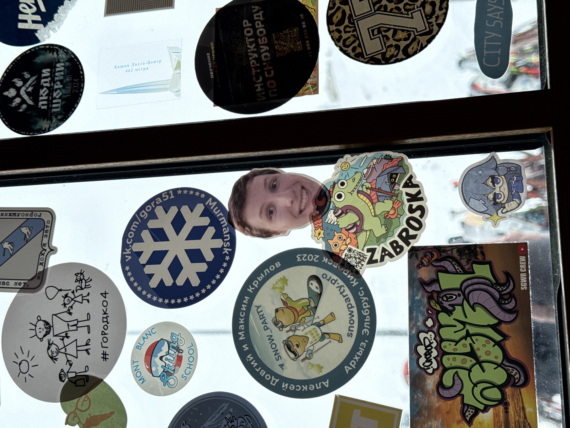 The image displays a close-up view of a window pane, heavily adorned with various stickers, primarily circular and rectangular. The window is bisected by a dark brown vertical frame on the right side. Through the clear areas of the glass and between the stickers, a bright, diffuse white exterior environment is visible, suggesting a snowy or overcast outdoor scene. Faint vertical elements in the background are consistent with skis or snowboards. Key stickers include: - A white circular sticker with a black stick-figure drawing of a family (two adults, two children, and a cat) and the text "#ГОРОДКО4". - A "Mont Blanc Skiing School" logo sticker. - A large blue circular sticker with a white snowflake design, inscribed with "vk.com/gora51" and "Murmansk" (reversed). - A circular "SNOW_PARTY" sticker featuring two cartoon bears (one skiing, one snowboarding), along with the names "Алексей Довгий и Максим Крылов" and the locations "Архыз, Эльбрус, Кировск 2023". - A die-cut photo sticker of a smiling young man's face, positioned above a green cartoon dragon/lizard sticker marked "ZABROSKA". - A black circular sticker stating "ИНСТРУКТОР ПО СНОУБОРДУ" (Snowboard Instructor) and "ОБУЧЕНИЕ С НУЛЯ ДО ПРОФИ," including a QR code and phone number. - A rectangular graffiti-style sticker on a sunset background depicting an octopus-like character and text resembling "СНОУБОРД", with "SGWR CREW" at the bottom. - A translucent sticker showing the "Башня Лахта-Центр 462 метра" (Lakhta Center Tower) design through the window. - Additional stickers feature "ЛЮДИ ШОРИИ ЭЛЬБЗА 2024," an anime-style character, a leopard-print "7", and "CITY SAYS". The pervasive winter sports themes, Russian language text, and specific references to Russian ski resorts (Arkhyz, Elbrus, Kirovsk, Shoria) and cities (Murmansk, St. Petersburg) indicate the scene is located within a facility associated with skiing or snowboarding in Unknown, Russia, likely a ski lodge, rental shop, or cafe.