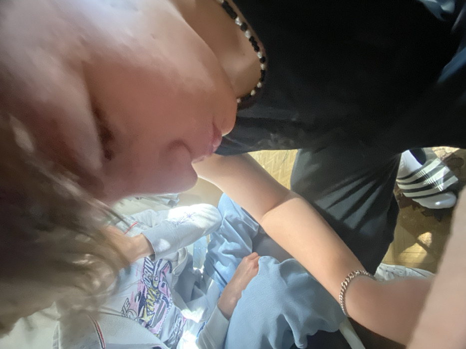 Two individuals are present in an indoor residential setting within the city of Troyan, Bulgaria. In the foreground, a young person is positioned in a low crouch, facing generally left. Their light brown hair partially obscures their face, revealing the profile of their nose and a slightly open mouth. This individual wears a black sleeveless top, black trousers, a black and white beaded necklace, and a silver-colored chain bracelet on their left wrist. Their feet are clad in white socks with three dark stripes and dark footwear. To the left and slightly behind the foreground subject, a second young person is partially visible, seated. This individual has light hair and is wearing a light-colored hooded sweatshirt with a graphic design on the front, along with light blue trousers. Their right arm is bent, with the hand near their chin. The environment features a wood parquet floor and is illuminated by ambient light originating from the left side of the frame.
