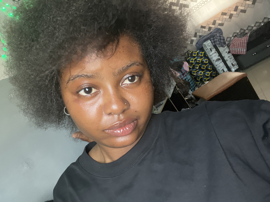 A portrait-oriented image, tilted approximately 30 degrees counter-clockwise, depicts a female individual with a dark complexion, dark brown eyes, and voluminous dark Afro-textured hair