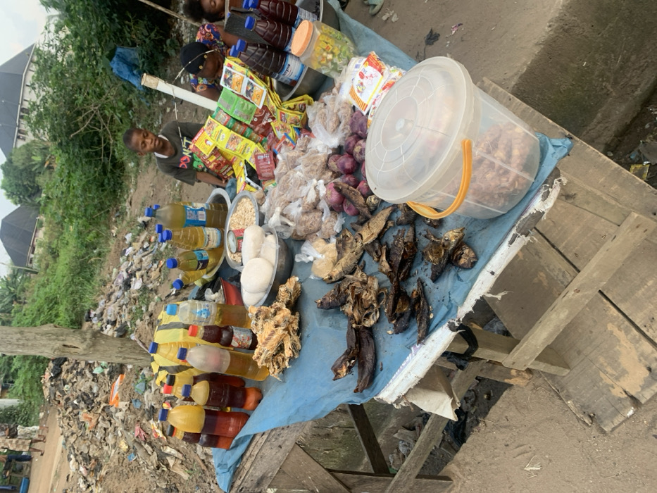 A street vendor's table displays an assortment of goods. Bottled liquids in various colors, packages of spices, onions, and bags of unidentified items are prominent. A clear plastic bucket with a yellow handle holds what appears to be dried goods. Dried fish are laid out on the blue tablecloth covering the table. Two individuals are partially visible behind the table, amidst a backdrop of greenery and a building. The setting suggests a busy, outdoor marketplace.
