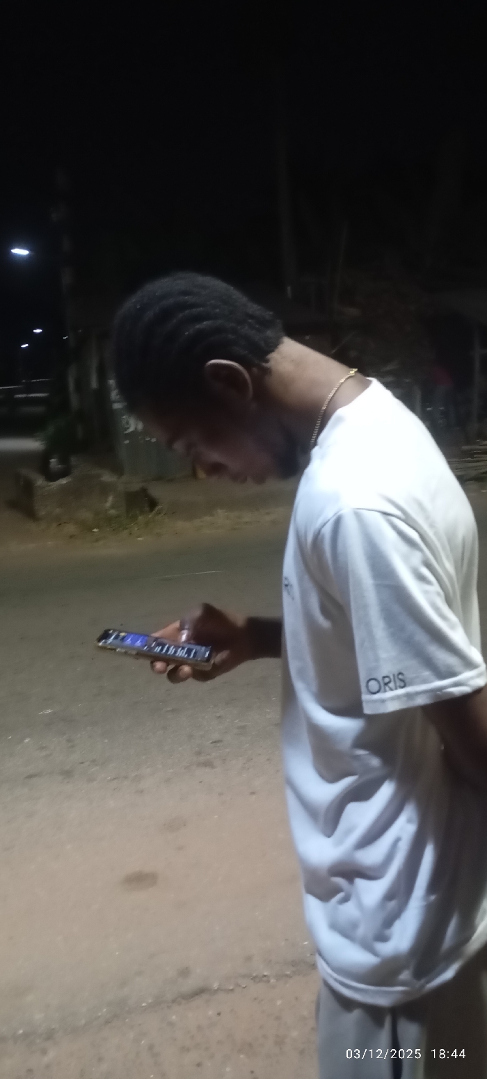 A man stands illuminated at night, absorbed in his mobile phone. He wears a white t-shirt with "ORIS" visible on the sleeve and a gold chain around his neck. His hair is styled in twists or braids. The background is dark, hinting at a street or outdoor setting with some greenery and lamplight in the distance. The timestamp indicates a date of March 12, 2025, at 18:44. The pavement in the foreground appears rough and uneven.