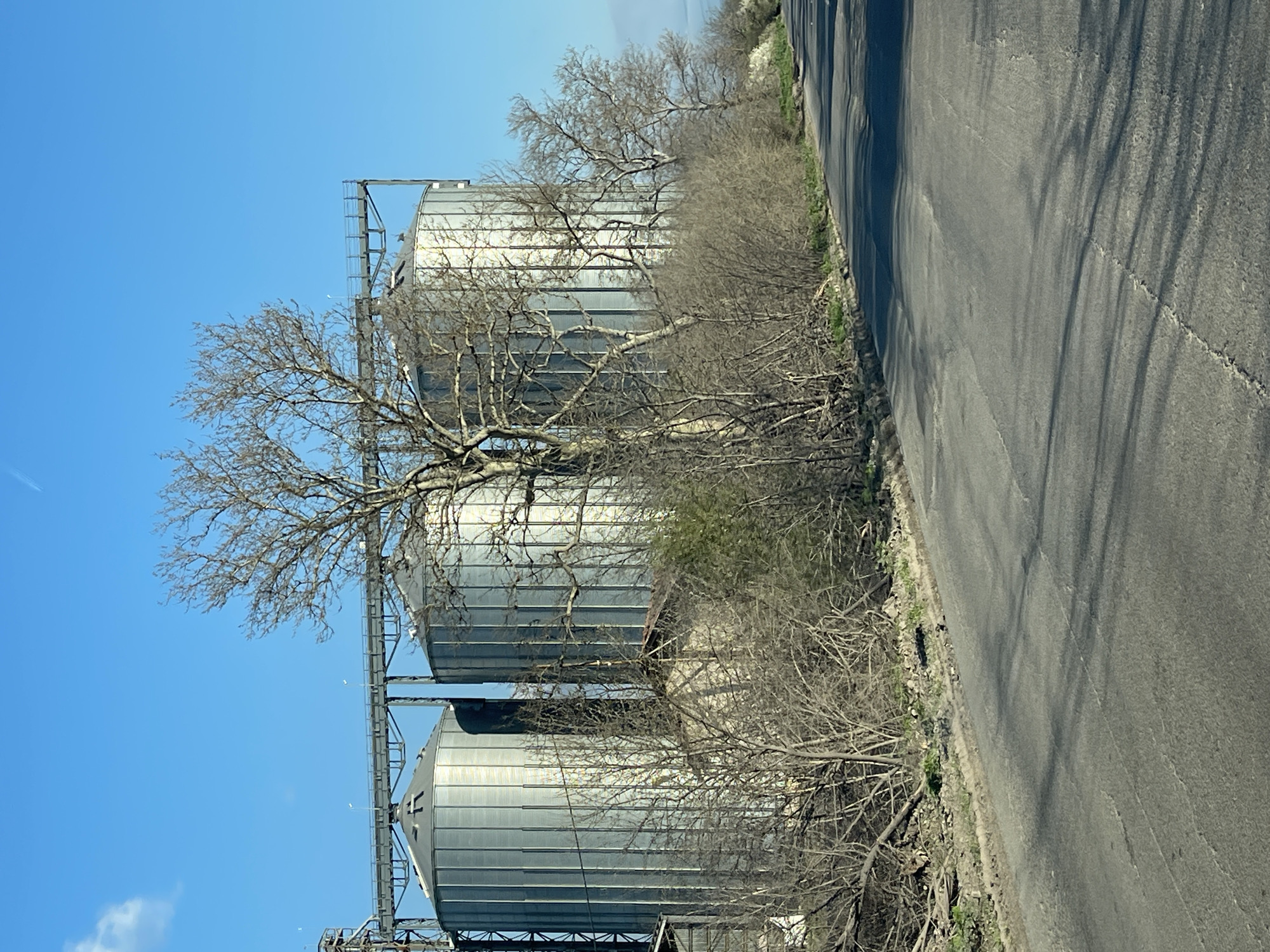 rural scene, likely taken on a road near the city of Bulgarovo, Bulgaria. Three large, metal grain silos are visible, arranged vertically in the frame and connected by metal framework and ladders. Deciduous trees with bare branches are positioned in front of and around the silos. A paved road runs along the right edge of the image, casting shadows. The sky is clear and blue, indicating a sunny day. There are bushes.