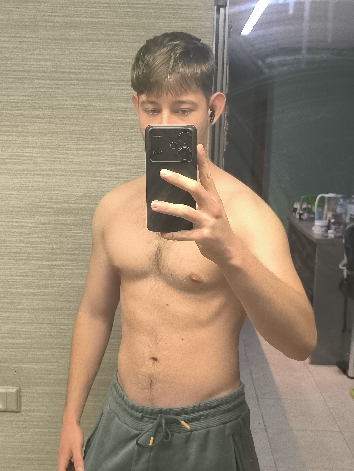 - "A shirtless young adult male, wearing grey sweatpants with orange-tipped drawstrings, is depicted taking a mirror selfie with a black smartphone held in his right hand" by FM-bMeLG3, licensed under CC BY 4.0