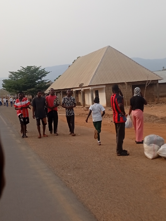 group of seven men and one woman walking along a dirt road in Ubbe, Nigeria
