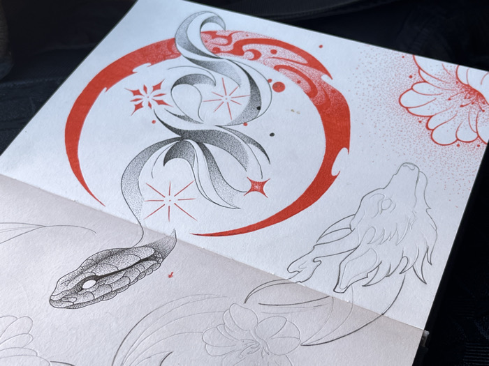 An open sketchbook displays several tattoo-style designs on an off-white, textured paper