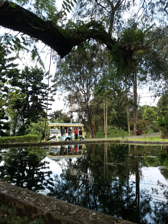 The image displays an outdoor scene within Ambositra, Madagascar, centered around a reflective pond and a parked multi-passenger vehicle, framed by dense vegetation and an overcast sky. In the foreground, a rectangular, man-made pond with dark, still water occupies the lower half of the frame. Its closest edge is a low, moss-covered concrete or stone barrier. The water accurately reflects the sky, surrounding trees, and the vehicle. Positioned in the mid-ground, immediately behind the pond, is a light-colored, open-sided multi-passenger vehicle, possibly a bus or jeepney, featuring a yellow roof and blue and white painted sides. At least two individuals are visible near the vehicle's rear passenger side; one person in a red shirt stands outside, facing away from the viewer, while another person in a red shirt is partially visible inside. Behind the vehicle, utility poles with wires and a white box-like structure are discernible. Further to the right, a red motorcycle is parked on a paved pathway that curves through a grassy, upward-sloping area. The background consists of a dense arrangement of various trees, including tall, slender specimens and broader foliage. A large, thick tree branch, covered with moss and ferns, extends horizontally across the top of the frame, partially obscuring the upper canopy and the bright, overcast sky. A single, thin, dark rope or vine hangs vertically from this prominent branch.
