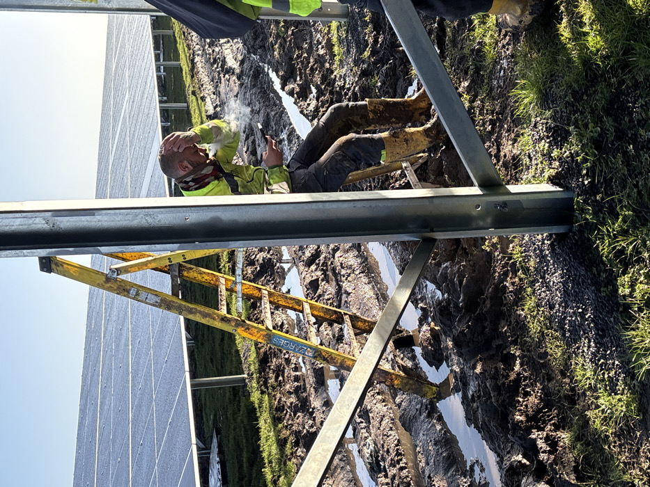 The image depicts an outdoor construction site within a solar farm in Grange Ville, Ireland, under clear daylight conditions