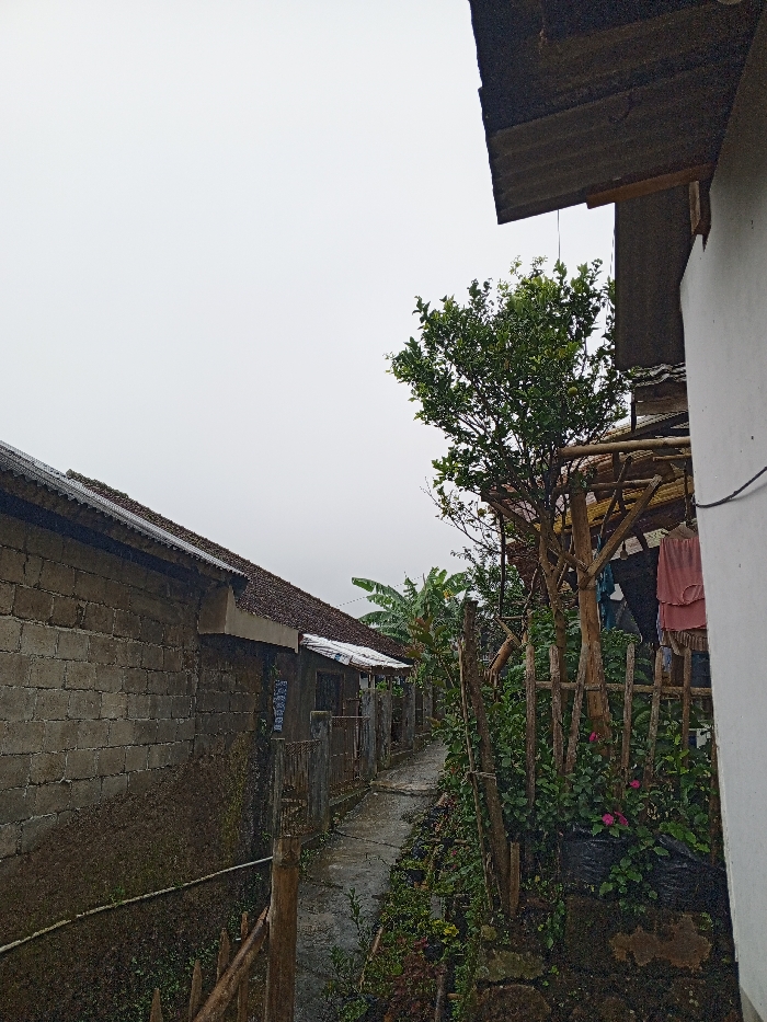 A narrow path stretches between two buildings under a grey sky. The building on the left is constructed of concrete blocks, with a tiled roof. On the right, a wooden structure supports hanging clothes and a flourishing garden. Vegetation spills onto the path, and a small tree grows between the structures. A weathered wooden fence lines the path on the right. The scene evokes a sense of rural life in a humid climate.