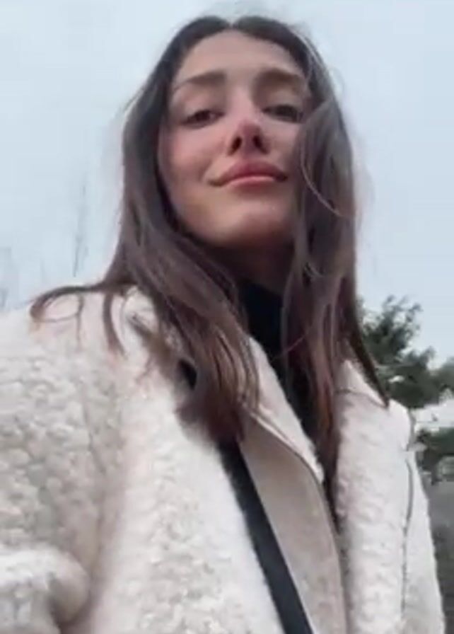 A woman with long brown hair, wearing a white jacket, a black turtleneck, and a black crossbody bag, stands outside of a ruined stone building under a cloudy sky. She looks directly at the camera and smiles slightly. She then glances off to the side.