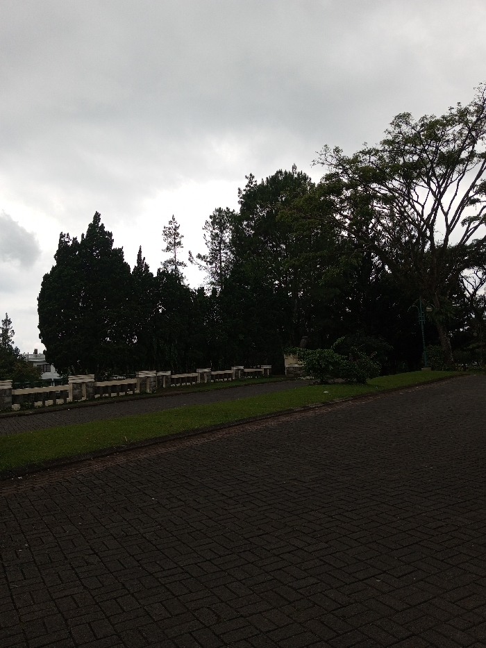 A brick road leads the eye into a landscape dominated by lush trees against an overcast sky. A low stone wall flanks the road, separating it from a grassy strip. The trees vary in size and shape, some towering over others. The atmosphere is somber due to the dark, heavy clouds.