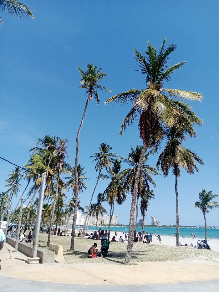 - "A vibrant beach scene under a clear blue sky features numerous palm trees lining the shore" by FM-aHka52, licensed under CC BY 4.0