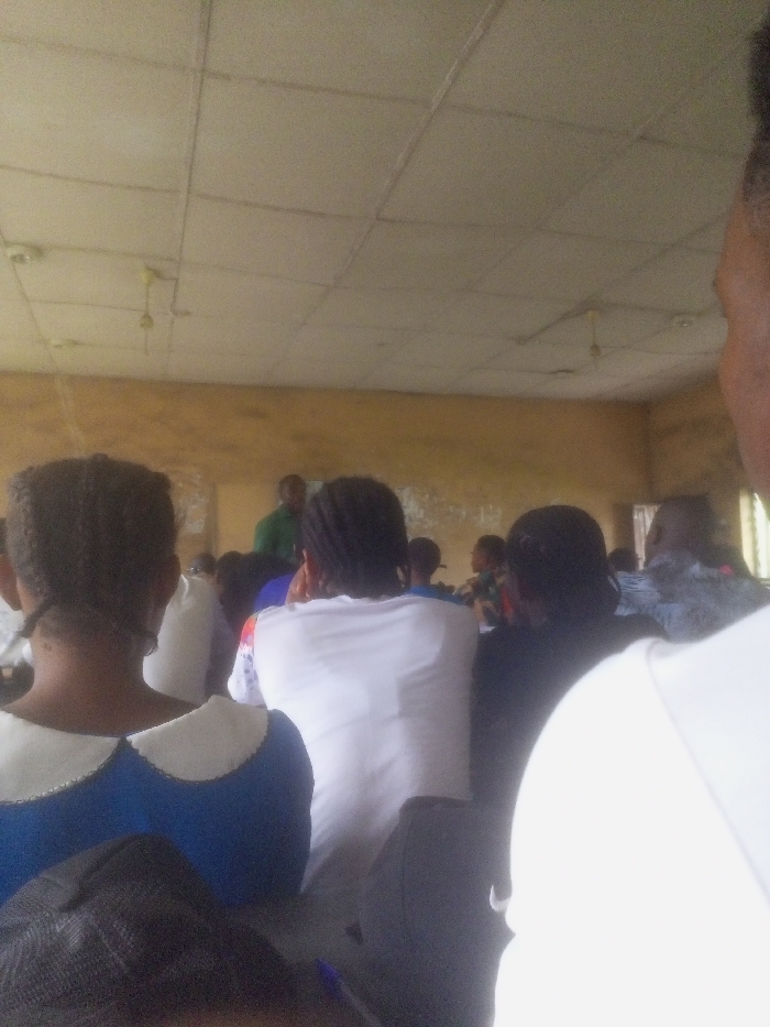 The image depicts an indoor gathering in Uyo, Nigeria. The perspective is from the rear of the room, looking towards the front. Approximately ten individuals are visible, primarily from behind, seated in rows. In the foreground, a person with braided dark hair wears a blue top with a white Peter Pan collar. Adjacent, another individual wears a white t-shirt. Further right in the foreground, part of a head and shoulder wearing a white shirt is visible. In the mid-ground, a person with dark hair in a black top is seated. At the front of the room, a blurred figure in a green shirt stands, facing the seated group, suggesting a speaker or instructor. The room features a white grid-patterned ceiling composed of acoustic tiles, from which several bare wires or incomplete light fixtures hang. The walls are a light brown or yellowish color, exhibiting areas of discoloration and wear. A black bag is partially visible in the lower left, and a blue pen rests on an unseen surface in the lower center. The overall environment suggests a functional classroom or meeting space.