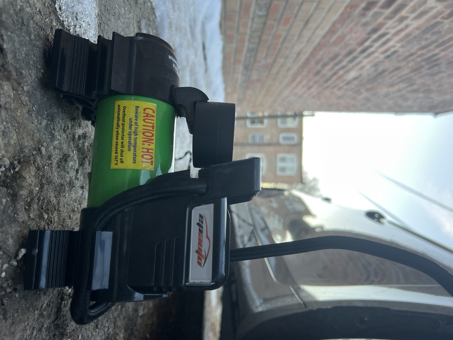 A green and black portable air compressor sits outside. The compressor has a yellow caution sticker that warns about high temperatures and says the overheat protector will shut off automatically when it exceeds 167°F. The label also has a small logo that looks like it says "epaula". The compressor is sitting near a car and a brick building. The photo appears to be taken on a partly sunny day with some snow on the ground.