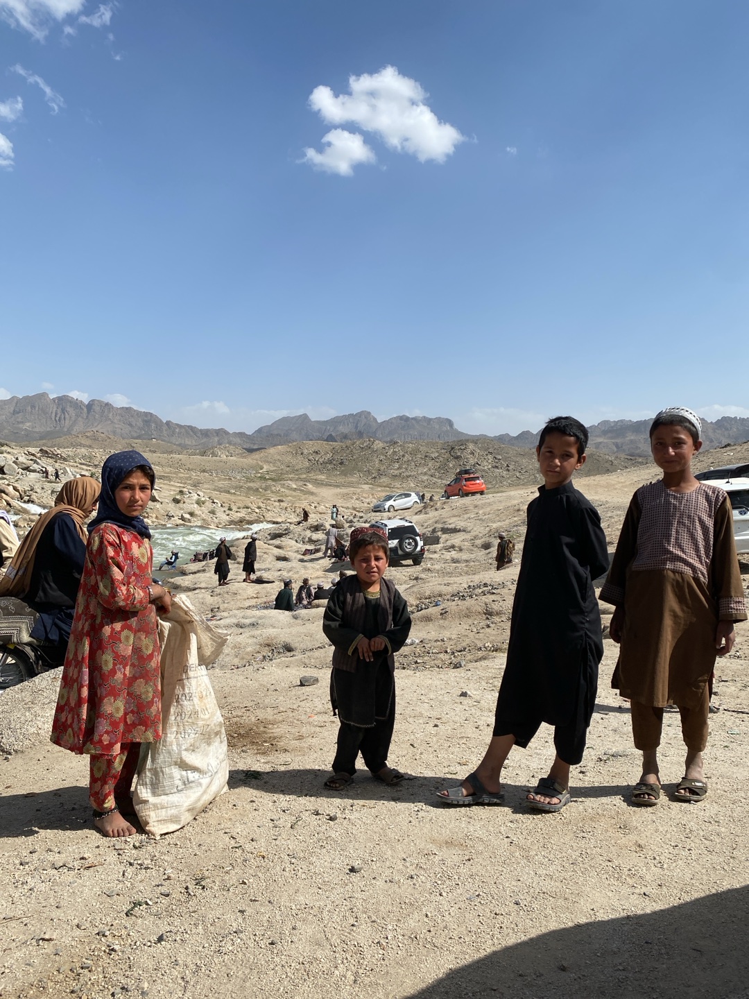 The image depicts four children standing on a gravelly terrain with mountains in the background under a clear sky with a few clouds. The terrain appears arid, with sparse vegetation. Behind the children, several cars are parked and several adults are seated. The child on the left is wearing a floral-patterned red outfit and holding a large, dirty sack. The next child is in a dark brown vest, trousers, and hat. The third child is wearing a black tunic and trousers. The fourth child is in a brown tunic. All four children are wearing sandals. Other people are scattered throughout the background.