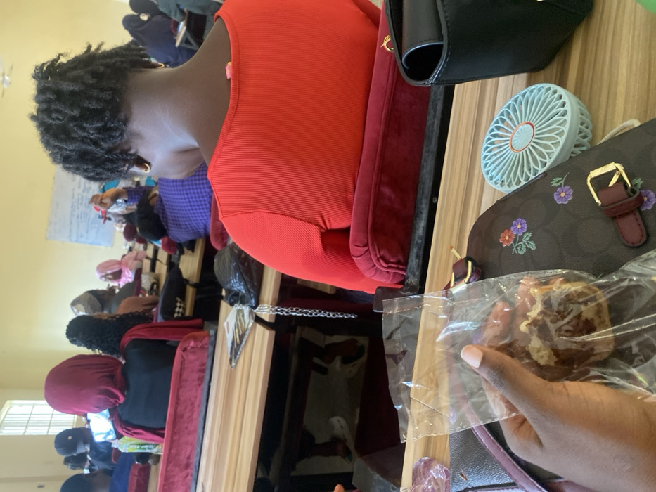The image depicts the interior of a classroom or lecture hall in the city of Baganakwo, Nigeria, viewed from the perspective of a seated individual. In the immediate foreground, a dark-skinned hand holds a transparent plastic bag containing a partially consumed baked good, resembling a muffin. On the wooden desk surface, a brown patterned handbag with floral embroidery and a gold-toned buckle, a light blue portable personal fan, and a black purse are present. Directly ahead, the back of a dark-skinned individual with short, dark dreadlocks or twists is visible, wearing a red ribbed long-sleeved top. A small pink item is clipped or attached near the back collar. This individual is seated in a red padded chair at a wooden desk. In the mid-ground and background, numerous other individuals, presumed students, are seated in rows at similar wooden desks and red padded chairs. Details of these individuals are mostly obscured or out of focus, but several are wearing head coverings, including at least one red hijab. One student in the distant background has an arm raised, indicating a potential question or participation. The classroom environment features light-colored walls, windows with security bars on the left side, a whiteboard with writing at the front of the room, and a ceiling fan visible overhead.