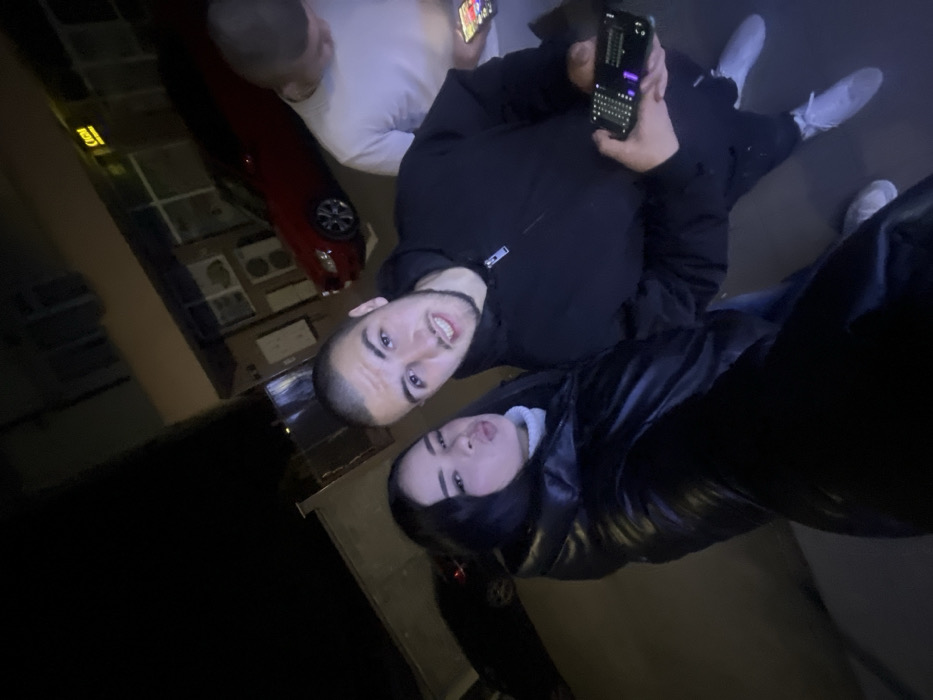 The image depicts three individuals on a paved surface at night in Asenovgrad, Bulgaria, with a multi-story building and vehicles in the background. In the foreground, a female with dark hair, wearing a white turtleneck and a dark, shiny puffer jacket, faces the camera with pursed lips. To her right, a male with short dark hair and a short beard, wearing a dark zippered hooded sweatshirt, faces the camera with his mouth slightly open. He holds a black smartphone horizontally in his left hand, displaying a screen interface with a grid of small squares on the left and a graphical waveform-like element on the right. Partially visible to the right and slightly behind the central male, a third individual, likely male, in a light-colored t-shirt, looks down at a smartphone held in both hands. The background features a red sedan parked on the right. Behind the vehicles and individuals is a building with a light-colored facade, featuring multiple windows, two air conditioning units, and a brightly illuminated yellow sign, possibly reading "CASH". A dark vehicle is partially visible on the far left of the frame. The scene is lit by artificial light sources, indicating nighttime.