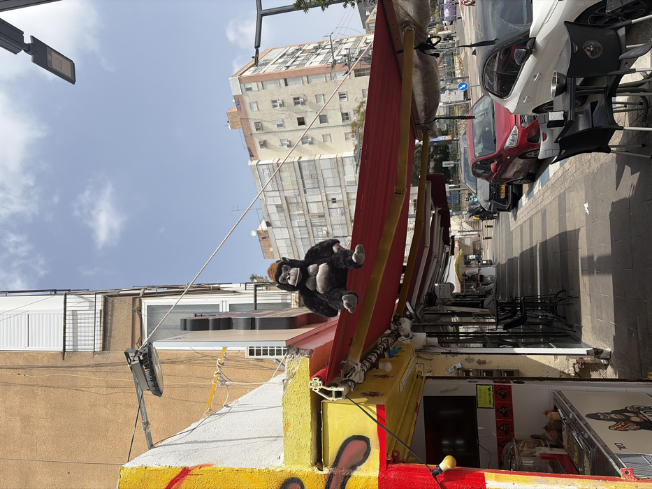 - "A large, black and light brown plush gorilla figure is seated centrally on a red fabric awning extending from a multi-story building facade in Givatayim, Israel" by FM-jWoq23, licensed under CC BY 4.0