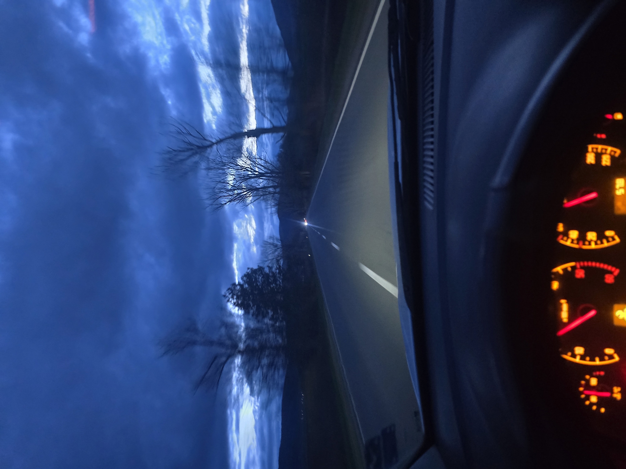 The image depicts a view from inside a vehicle driving along a road in Riahovtsite, Bulgaria. The dashboard is visible on the right side of the frame with illuminated gauges. The road extends into the distance with a single solid white line marking the center. Bare trees line the left side of the road under a cloudy, twilight sky. There is a light source ahead on the road.