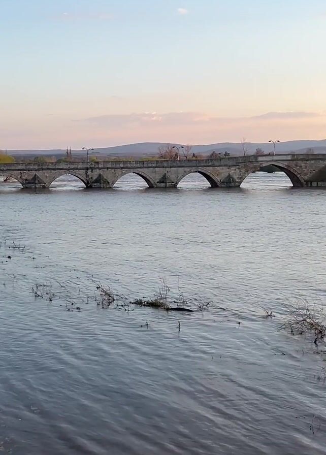 The camera slowly pans up in a horizontal fashion to reveal a long bridge with stone arches going across a wide river. The river has gentle ripples on the surface, and some small plants are visible growing near the shoreline. Behind the bridge is a small town with red-roofed buildings and a church steeple. Rolling hills are in the far distance. The sky is blue with some pink and orange hues from the setting sun. A dog barks in the background.