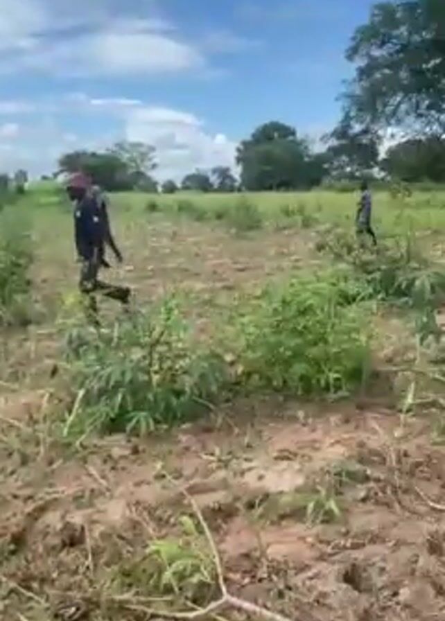 grassy field with trees in the background under a partly cloudy sky. People are visible walking through the field. Suddenly, a loud explosion is heard.