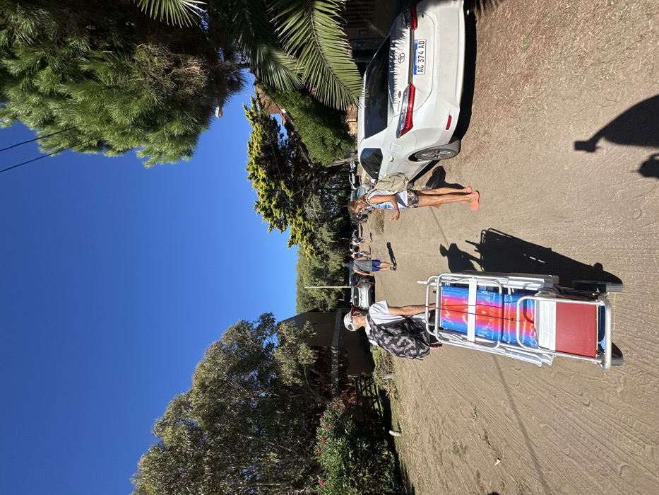 A daytime scene shows a sunny dirt road. A white car is parked. A woman in a white shirt and shorts stands near the car. A man pulls a cart carrying beach chairs. Trees border the road. The sky is blue. A shadow is cast on the road. Other people and cars are visible in the background.