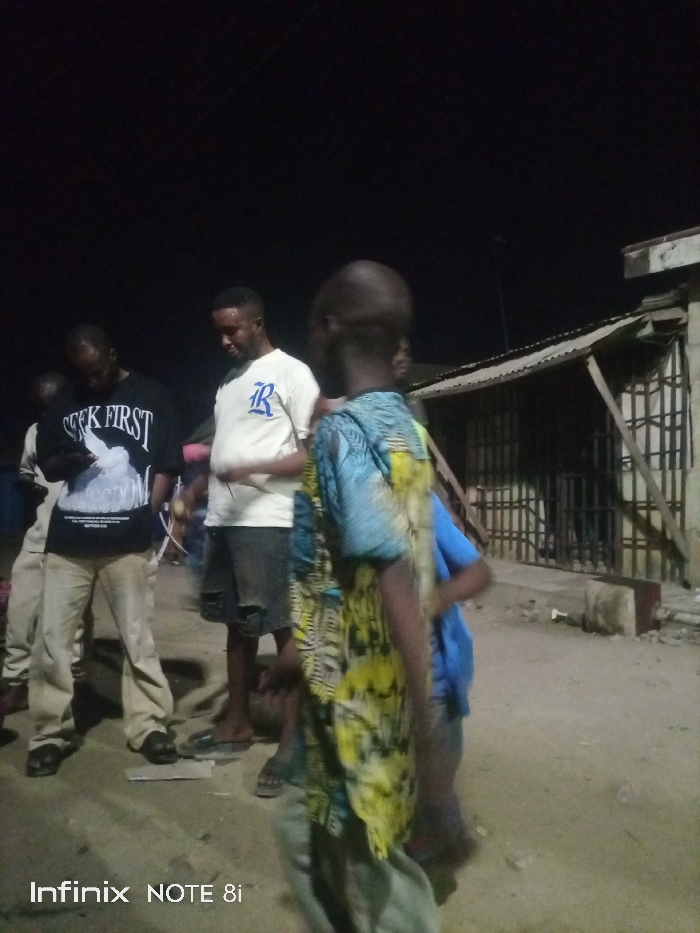 At night, several people gather outdoors. One man in a black t-shirt with white lettering and beige pants looks down at a phone. Another man in a white t-shirt with a blue letter and black shorts stands nearby. A child in a yellow and blue patterned shirt faces away from the camera. Behind them, a building with a metal gate is visible. The scene is dimly lit, with limited details discernible in the dark surroundings. "Infinix NOTE 8i" is written in the bottom left corner.
