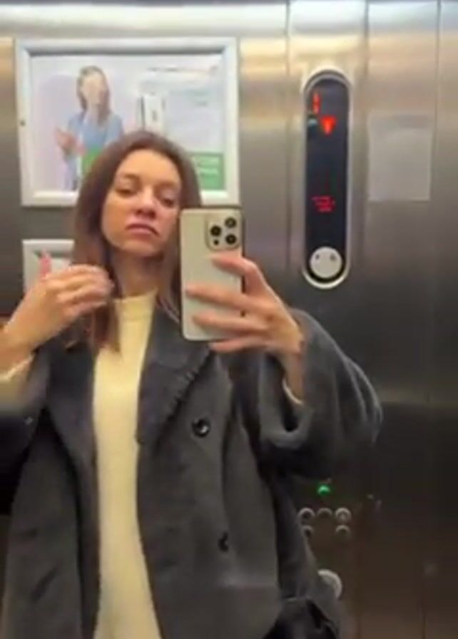 A woman in an elevator is taking a selfie. She is wearing a gray coat, a cream-colored sweater, and black pants. She has shoulder-length brown hair. The elevator has a metal interior and a poster on the wall. The elevator is currently on the first floor.