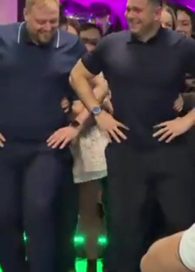 A group of about a dozen people are dancing and laughing. They are standing close together, with their arms around each other's waists. Two men in dark blue polo shirts and dark pants are in the front. They are both smiling. A few women are standing behind them. The background is a purple curtain. A green light is shining on the floor.