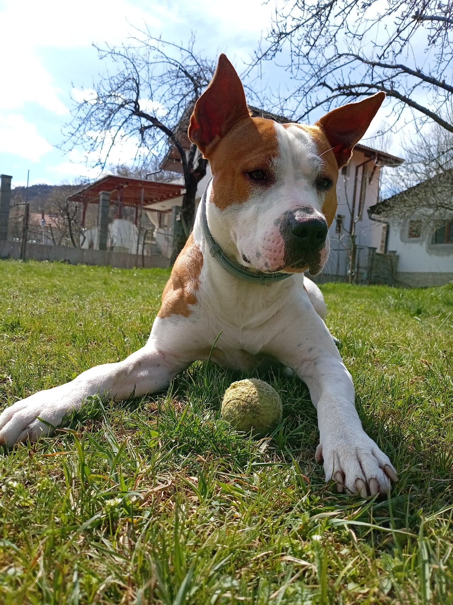 In Apriltsi, Bulgaria, a medium-sized American Staffordshire Terrier lies in a grassy yard. The dog has a white and brown coat, erect ears, and a grey collar. A worn tennis ball is positioned near its front paws. Behind the dog, a residential area includes houses with tile roofs, fences, and bare trees against a partly cloudy sky. The scene is bathed in sunlight.