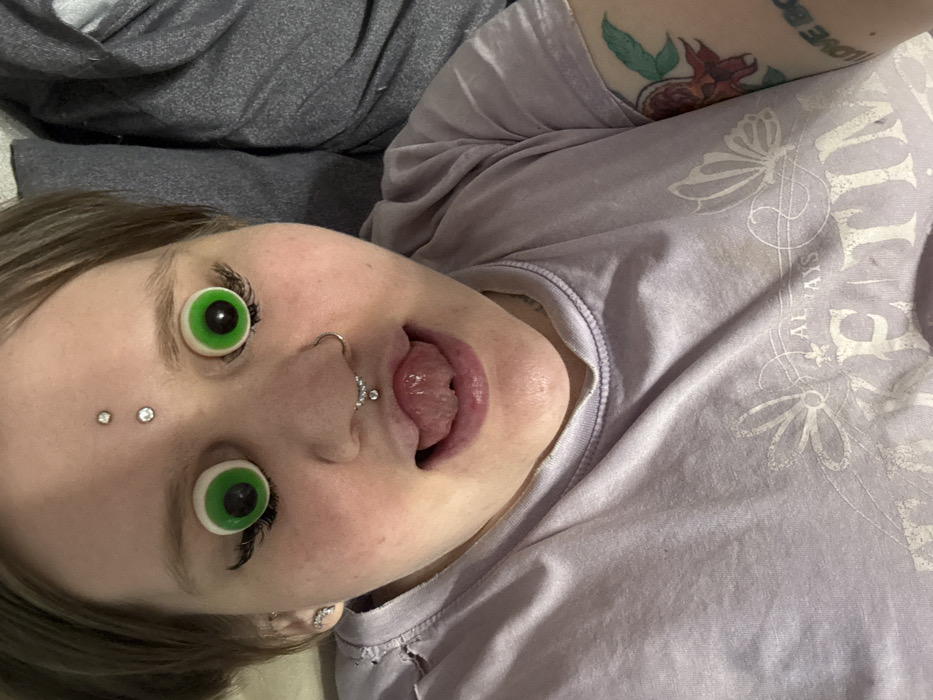 A close-up, eye-level shot features an individual from the chest up, positioned in what appears to be an indoor setting. The person has light skin and short, light brown hair. Two large, green and black novelty eyeball props, each with prominent black false eyelashes, are placed over the individual's eye sockets. The person's mouth is open, with the tongue extended outward. Multiple facial piercings are visible: two dermal piercings vertically aligned on the forehead, a jeweled septum ring, a small stud in the philtrum (Medusa piercing), and a simple silver hoop in the left nostril. A small, sparkly stud is present in the left earlobe. The individual wears a light purple t-shirt with faded white graphic designs, including what appears to be a butterfly and text on the front. A colorful tattoo featuring a red/orange flower and green leaves is visible on the upper left arm, with additional faint text underneath. The background to the right is a blurred dark grey fabric, while the left side shows a lighter, beige-colored surface. The lighting suggests an indoor environment. The specific city location of Saratov, Russia, is not discernible from the provided image.