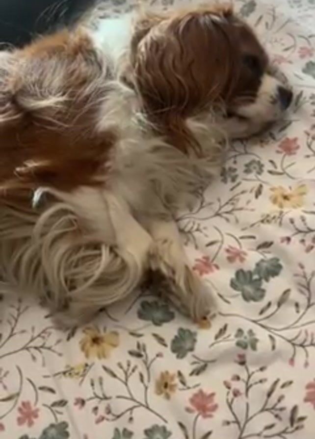 A brown and white Cavalier King Charles Spaniel is sleeping on a bed with a floral patterned bedspread. A hand moves towards the dog's paw, extending a finger and poking at the fur near the dog's toes. The dog does not react to the touch. The camera is held overhead.