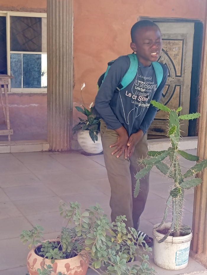 Location: Unknown, Unknown. A young male stands on a light-colored tiled patio or veranda, his body slightly bent forward. He wears a dark grey long-sleeved shirt with white text, khaki-colored trousers, and a light blue backpack. His hands are clasped over his crotch area, and his face exhibits a strained expression, with eyes squinted and mouth partially open. He appears to be a boy or adolescent. The background features a light brown-painted wall. To the male's right is a dark wooden door with an arched top. To his left, a white-framed window with multiple panes is visible. Two fluted columns, one partially on the left and one on the far right, define the space. A white planter containing a peace lily plant is positioned between the left column and the door. On the tiled floor in the foreground, a terracotta-style pot with a green leafy plant sits to the left, and a white plastic bucket containing a tall, multi-stemmed cactus is to the right. The scene is illuminated by natural light.