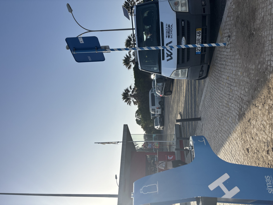 The image depicts an outdoor scene in Oeiras, Portugal, under a clear, bright sky. In the immediate foreground on the left, a blue public water fountain or refill station is visible, bearing an illustration of a bottle and partial text including "simas" and "OEIRAS." To the right, a white Ford Transit van, bearing the Portuguese license plate "27 GR 46" and "WANTED SURF SCHOOL" text on its side, is parked. Directly in front of the van, a blue rectangular road sign is mounted on a pole with blue and white diagonal stripes. A modern kiosk with a red roof and glass walls stands behind the water station. One individual, a male in a light-colored shirt and dark trousers, is standing near the kiosk entrance. A gravel parking lot in the midground contains several other parked vehicles, including a white van, a dark grey hatchback, and two sedans. Black bollards mark the edge of a cobblestone pavement. The background features numerous palm trees and green foliage, with a flagpole displaying a light-colored flag near the kiosk, and a street light pole with a solar panel to the right.