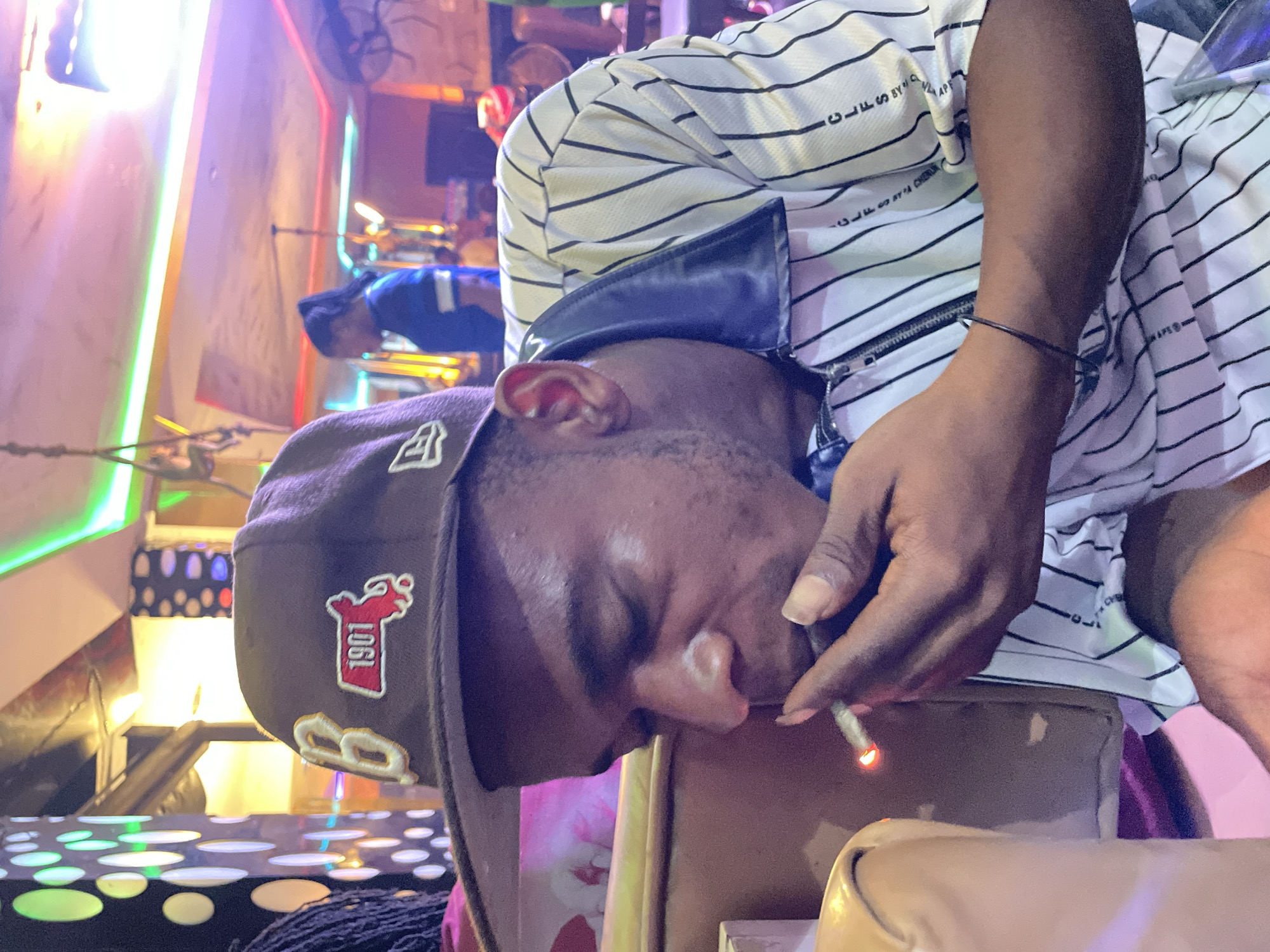 An African man with dark skin is seen sitting in a dimly lit room, smoking a cigarette