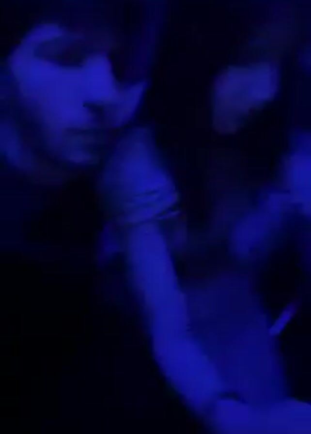 Two individuals, a man and a woman, are visible in a dimly lit or dark setting. The man has facial hair and is wearing a dark shirt. The woman is wearing a light-colored dress. The scene is illuminated with a blue light, which changes throughout the video. The man and woman appear to be together and are facing the camera. The video contains music.