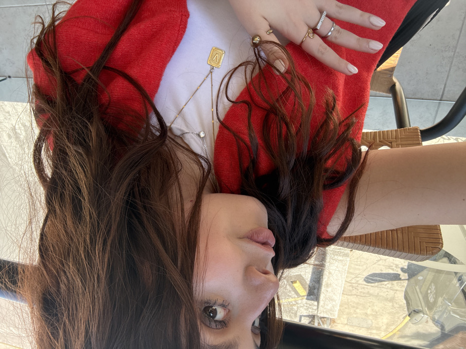 A woman with brunette hair and fair skin is depicted at an inverted angle. She wears a red sweater over a white shirt with a gold pendant necklace. Her hand, adorned with several rings, is visible in the frame. The image is captured indoors, with natural light illuminating her face. A glass table and chair are partially visible in the background.