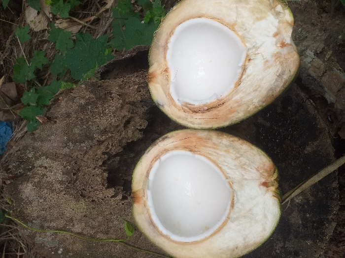 - "Two halves of a young coconut lie on a rough, weathered tree stump" by FM-lF8872, licensed under CC BY 4.0