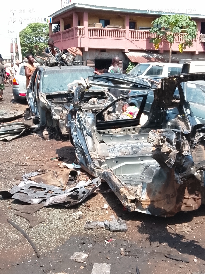The image displays an outdoor scene in Onitsha, Nigeria, primarily featuring extensively damaged and stripped vehicle chassis
