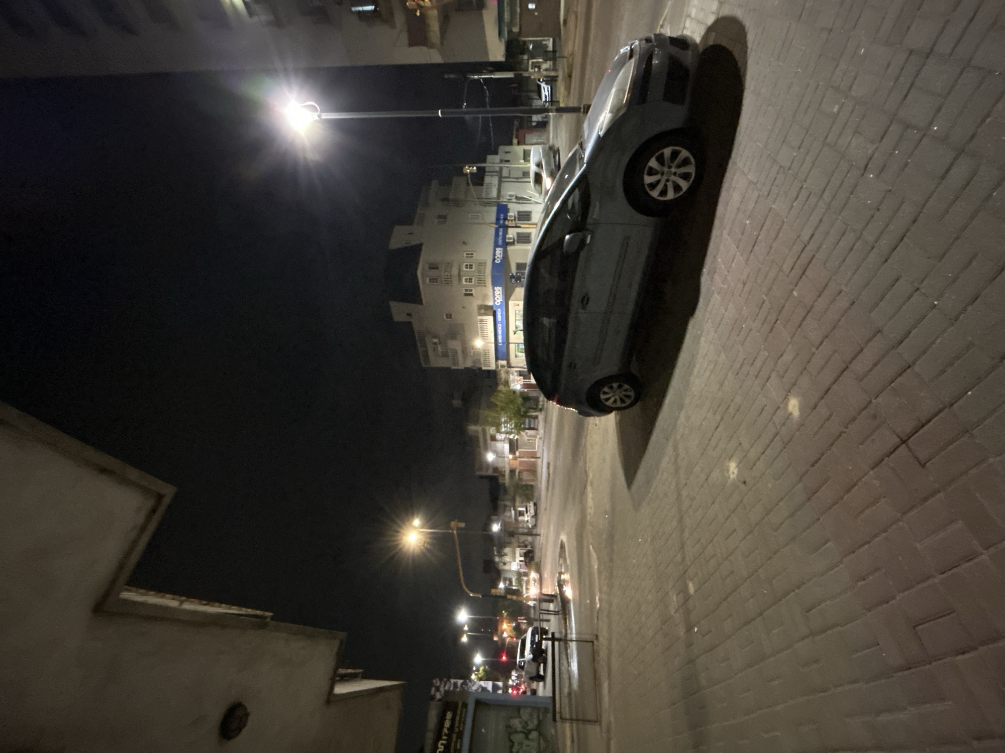 The image presents a nighttime urban street scene captured at an intersection in Berazategui, Argentina. The foreground features a sidewalk constructed from reddish-brown rectangular pavers arranged in a herringbone pattern. A light grey hatchback vehicle, consistent with a Citroën C4 Picasso, is parked parallel to the curb on the right side of the sidewalk, facing towards the left. The underside of a light-colored concrete building overhang occupies the upper left quadrant. A low, dark metal barrier is positioned on the sidewalk to the left. The midground reveals the street, a dark paved surface, with a reflective wet patch near the metal barrier. Multiple streetlights illuminate the area, casting bright white and yellow light. A tall, dark streetlight pole with an active luminaire stands on the right side, directly illuminating the parked car. In the intersection, a white pickup truck with active headlights is visible, positioned in the left lane and facing away from the viewer. Other vehicles are faintly discernible further down the road. A traffic light fixture, displaying a yellow signal, is mounted on a pole above the intersection. The background is dominated by several buildings. Across the intersection, a prominent multi-story, light-colored building with balconies and a distinctive dark roof features a ground-level blue awning bearing the text "apres centro medico" and "apres." To the right of this building, a taller structure with visible balconies is partially observed. Further down the radiating streets, additional buildings are visible, illuminated by scattered lights. Graffiti is present on a metal roll-down security shutter of a building on the far left. No individuals are present in the visible portion of the scene. The sky is dark, indicating clear nighttime conditions.