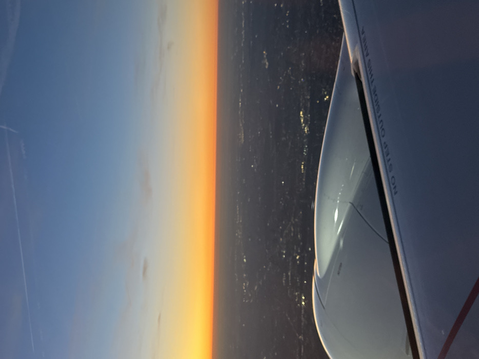 This image presents an aerial view captured from an aircraft during twilight, identified as being over the urban area of Achères, France. The upper half of the frame displays the sky, transitioning from a deep blue at the zenith to a vibrant orange and yellow gradient at the horizon line. A faint white contrail is visible diagonally across the upper-left blue sky. Below the horizon, an extensive urban landscape stretches into the distance, characterized by numerous scattered artificial lights against a dark, hazy backdrop. The illumination patterns suggest a sprawling city at night. In the foreground, occupying the lower portion of the image, are elements of the aircraft. A section of a light-colored wing, with a visible red stripe along its edge, extends across the lower-right. Printed in dark text on the wing surface is the instruction "NO STEP OUTSIDE THIS AREA." A large, smooth, light-colored engine nacelle or cowling occupies the lower-left to mid-left, partially obscuring the city lights below. Its surface exhibits subtle reflections from ambient light. No people, specific actions, or direct interactions are discernible within the scene.