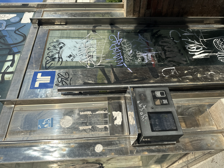- "The image depicts a vandalized public access structure, likely an elevator or transit entrance, in Barcelona, Spain, indicated by the prominent blue Transports Metropolitans de Barcelona (TMB) logo" by FM-wv6yi1, licensed under CC BY 4.0
