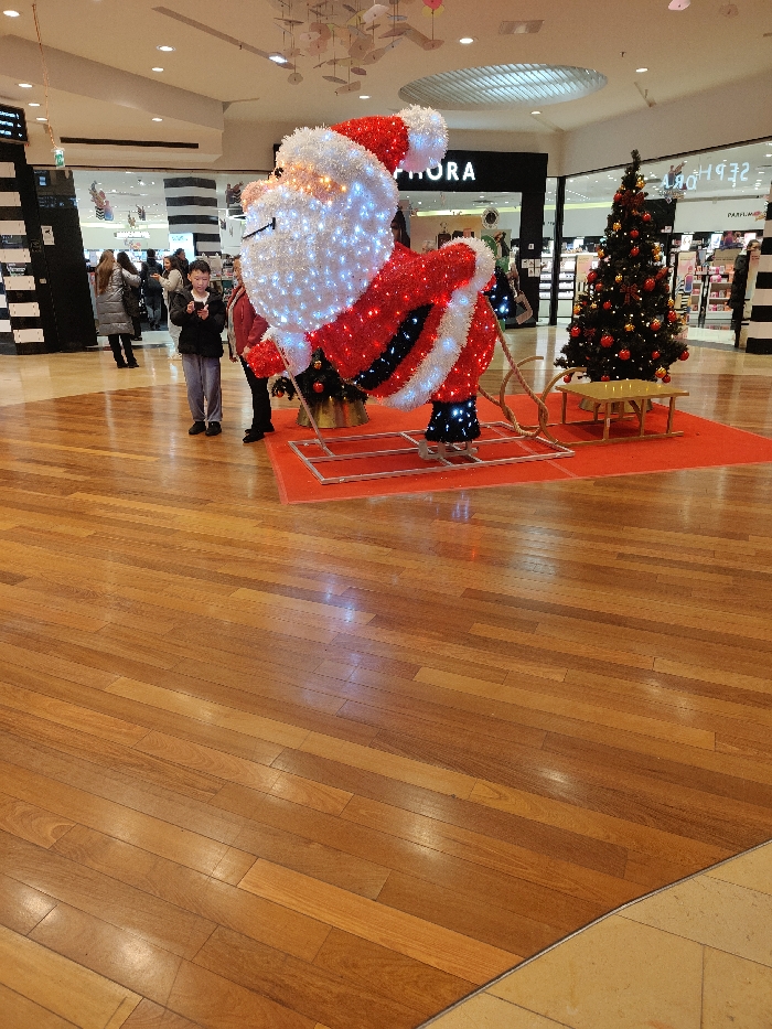 The image depicts an indoor scene within a shopping mall in Strasbourg, France, featuring a holiday display. The floor in the foreground and mid-ground is composed of polished light brown wooden planks, reflecting overhead lighting. In the center, a large Christmas display rests on a rectangular red carpet. This display includes a prominent, illuminated Santa Claus figure, constructed with red and white lights, positioned as if pulling a sleigh. The Santa figure is mounted on a silver-colored metallic frame. To the right of the Santa figure, a decorated Christmas tree stands, adorned with red spherical ornaments and white lights. Adjacent to the tree is a small, light-colored wooden bench or sled-like structure. To the left of the Santa figure, a young male stands facing forward, dressed in a dark jacket and light gray pants. He holds a mobile phone with both hands and looks down at its screen. Partially obscured behind the Santa figure and to the right of the young male, another individual is visible wearing a red jacket. In the background, other blurred figures of shoppers are present near the entrances of several retail establishments, one of which is clearly marked "SEPHORA."
