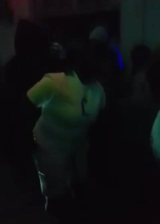 crowd of people in a dimly lit room, possibly a nightclub or party. Various colored lights illuminate the scene, including blue, red, and green. People are standing and moving around, some visible only as silhouettes. The room appears crowded, and the source of the lighting is unclear, though some appears to be neon or LED. The video is shaky and not very clear, making specific details difficult to discern.