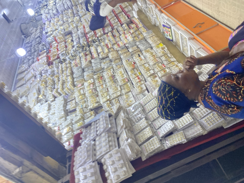 An indoor retail scene in Satellite Town, Nigeria, depicts a jewelry shop or market stall