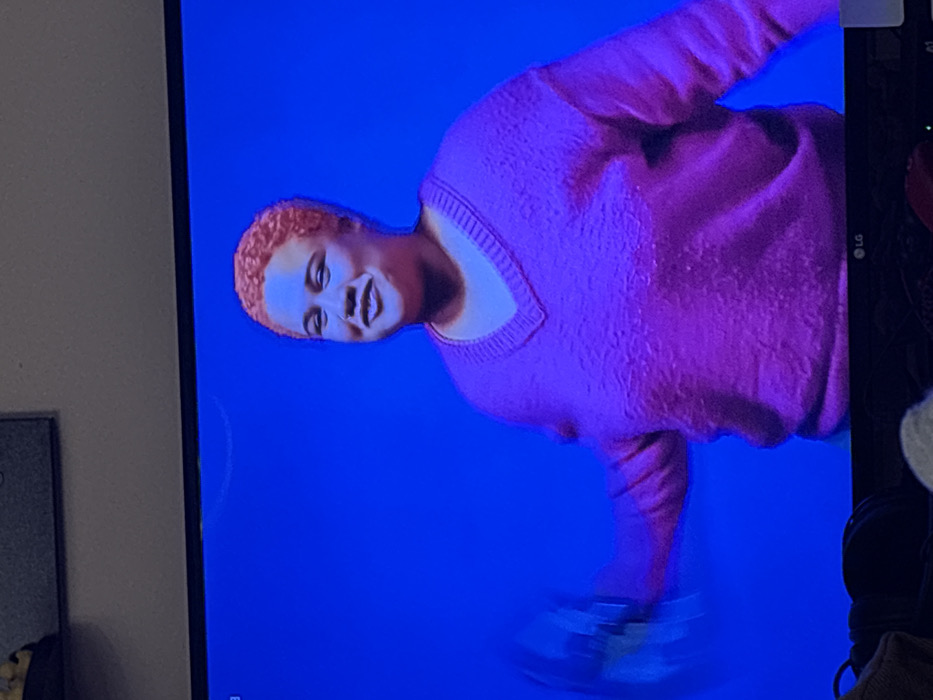 The image is a photograph captured of a television screen displaying a person. The screen presents a smiling individual with medium skin, short, curly, reddish-orange hair, and wearing a textured pink V-neck sweater. The person's left arm is extended laterally, holding an indistinct, blurry object. The background of the display is a solid, bright blue. A partial 'B' or 'BB' is visible in the top-left corner of the screen content. The television itself is branded "LG," with the logo visible on the bottom center bezel. Above the screen, a dark, neutral-colored wall is visible, featuring a rectangular object mounted high, topped by a small, yellow, rounded object. Below the screen, a dark surface, a pair of black headphones, and other undefined light-colored objects are present. There is no visual information within the image to specify a location in the city of Sofia, Bulgaria.