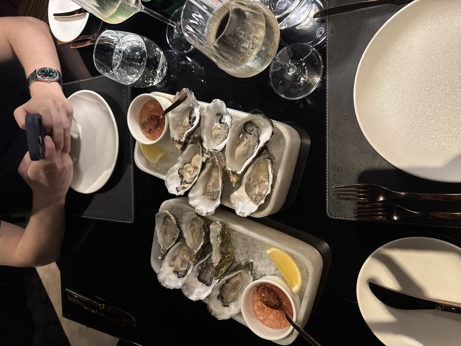 A table setting features two platters of oysters on ice, each with a wedge of lemon and a small ramekin of sauce. White plates are set with forks and a knife. Wine glasses and a decanter filled with white wine are also on the table. An arm holding a cell phone is visible, suggesting someone is taking a picture of the food.