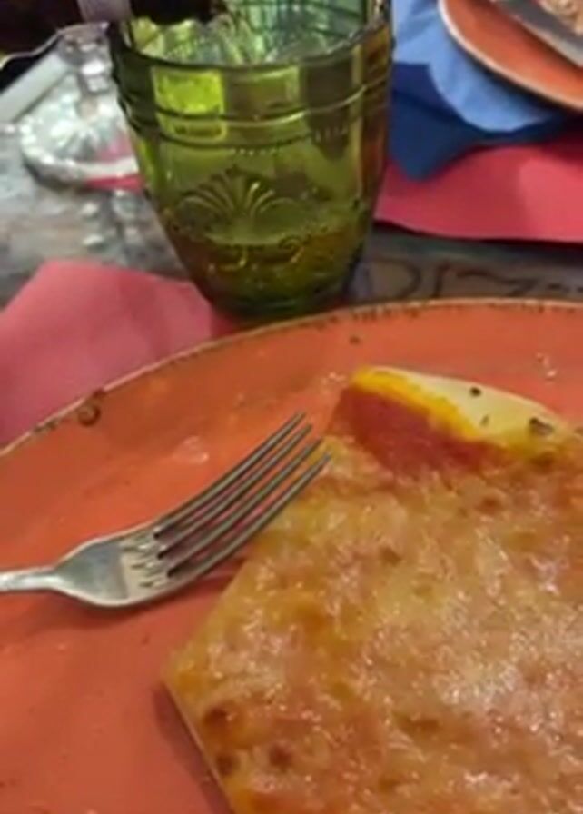 someone pouring a bottle of what appears to be olive oil into a green glass. There is a slice of pizza on an orange plate in the foreground. A fork is also visible on the plate. Other plates, napkins, and utensils are present on the table, suggesting a dining setting.